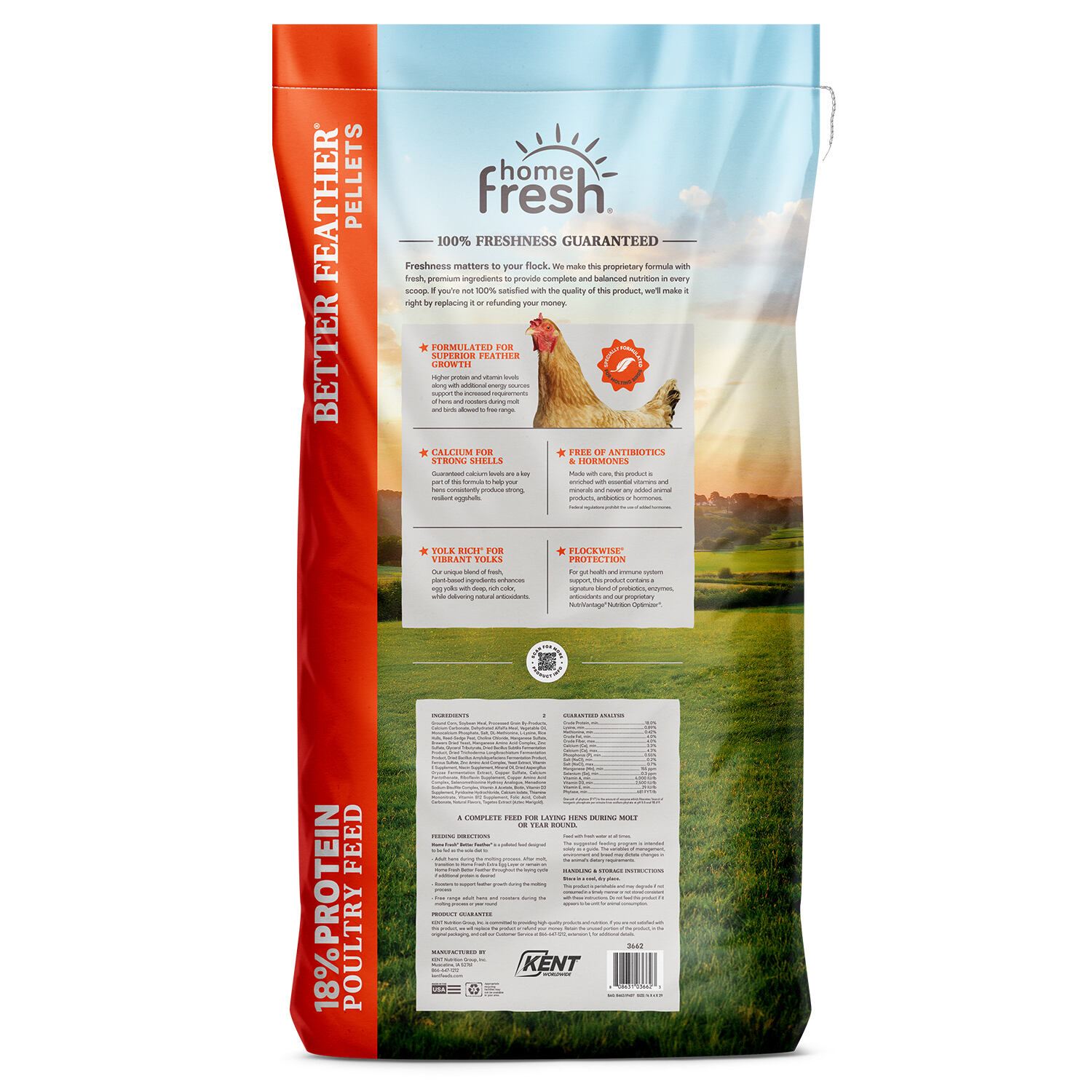Home Fresh® Better Feather™ is an 18% protein, high-energy, calcium-fortified grain diet formulated specifically to support feather growth and egg production in layers as they go through a molt. As a complete, balanced diet, no additional nutrient supplementation is required. A natural choice for chickens, both egg-producing hens and roosters. This is also a great option as a higher protein layer feed and for free-range layers.