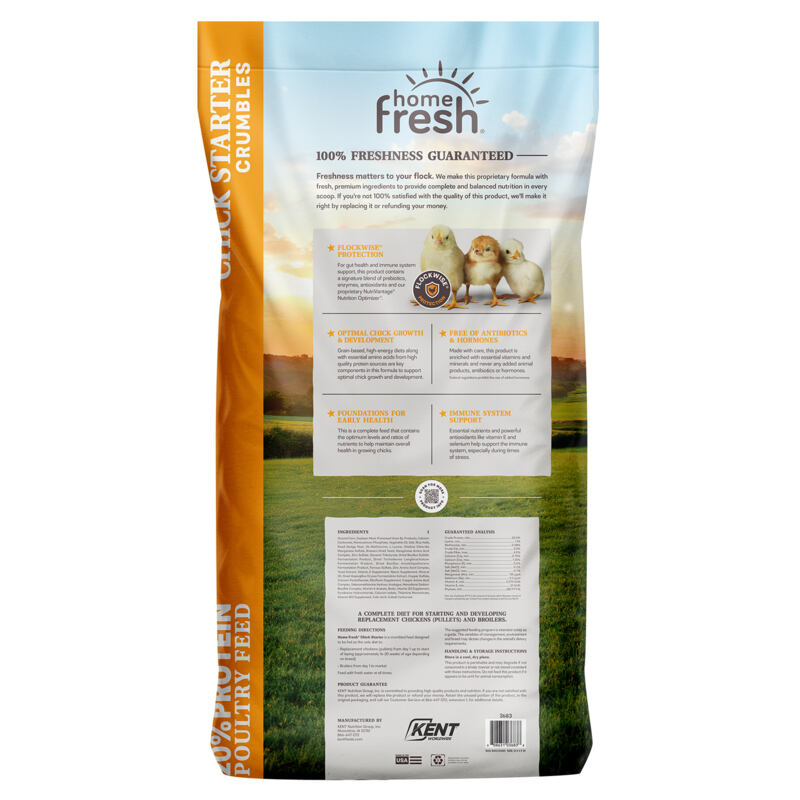 Replacement Chickens (Pullets): Feed Home Fresh Starter as the sole diet from day 1 to the start of laying (approximately 16-20 weeks of age depending on breed). Broilers: Feed Home Fresh Starter as the sole diet from day 1 to market. Provide fresh water at all times. The suggested feeding program is intended solely as a guide. The variables of management, environment and breed may dictate changes in the animal’s dietary requirements. For additional feeding recommendations, consult your local KNG feed representative, refer to the Home Fresh Poultry brochure, or visit kentfeedsdev.n-s.dev. Store in a cool dry place. This product may spoil if stored under adverse conditions. Do not feed this product if believed to be unfit for animal consumption.