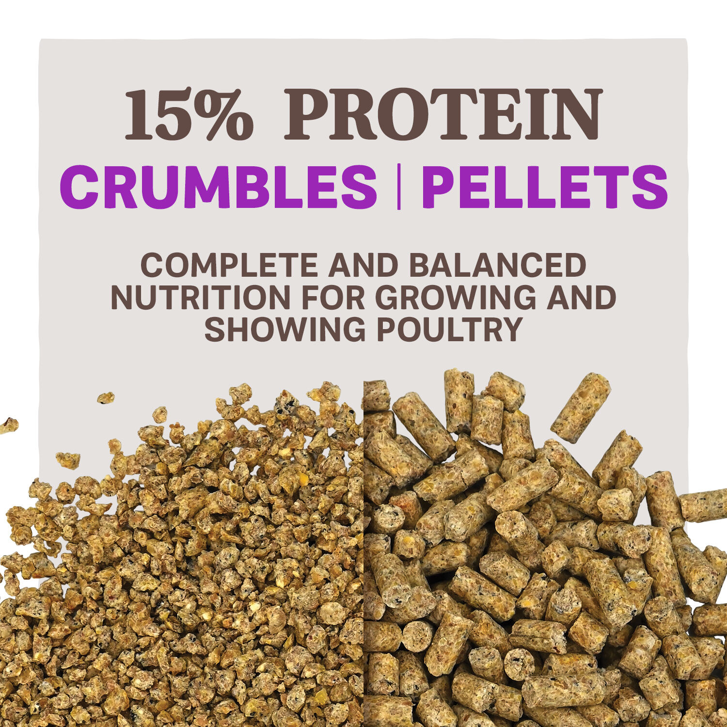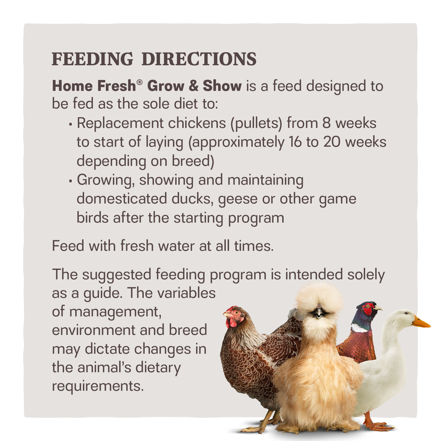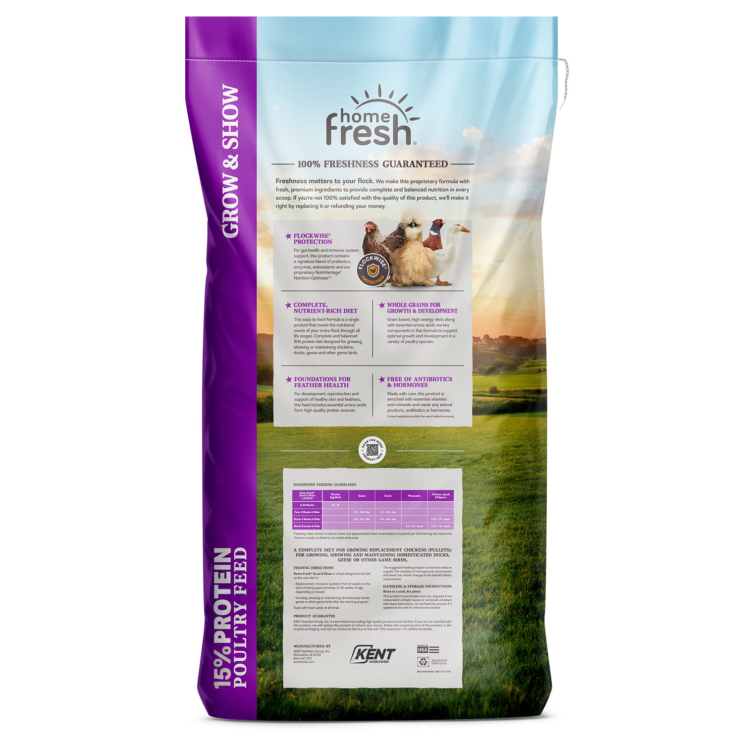 Home Fresh® Grow & Show is a complete, balanced 15% protein diet designed for growing replacement chickens (pullets). It is also ideal for growing, showing, or maintaining domesticated ducks, geese, and other game birds.