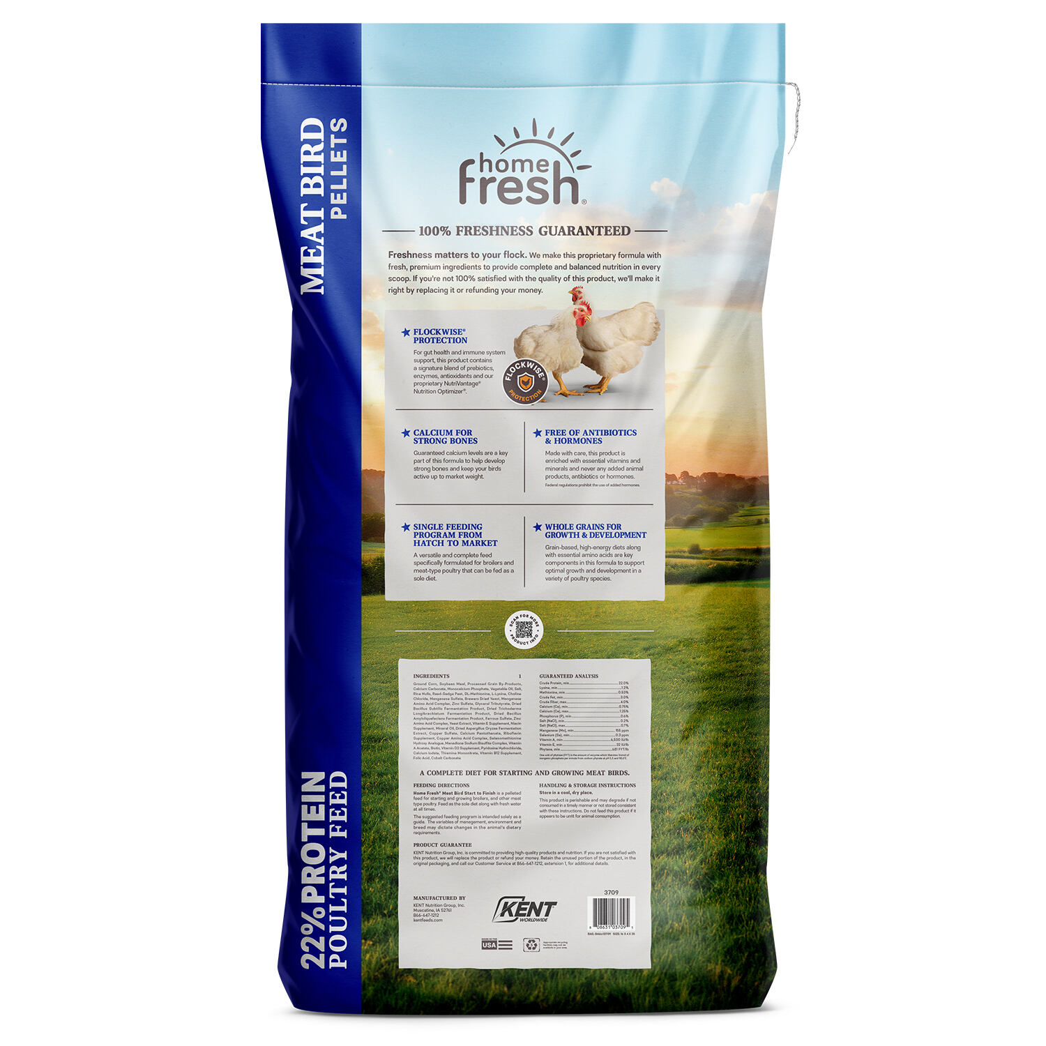 Home Fresh® Meat Bird Start to Finish is a 22% protein, high energy, grain-based complete diet for starting and growing meat birds. Home Fresh Meat Bird has guaranteed levels of essential amino acids to promote growth and meat quality.