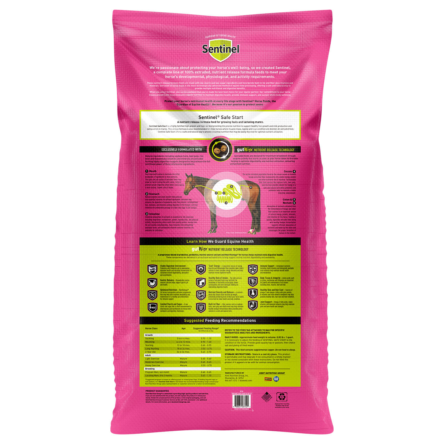 KENT SENTINEL SAFE START is a high protein, high fat, pressure cooked feed that offers a safe and natural way to provide essential nutrition to lactating mares and young growing foals. SENTINEL SAFE START can also be fed to show horses on low protein hay or when extra shine and condition is desired.